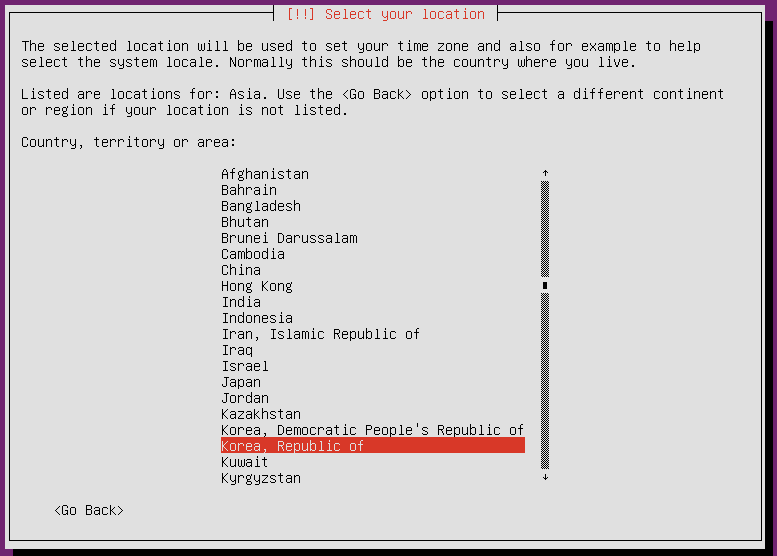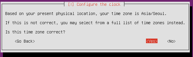 아까 지역을 설정한대로 time zone 설정을 해줍니다. 맞으면 yes로 넘어가면 되고, 아니라면 수동으로 변경하시면 됩니다.