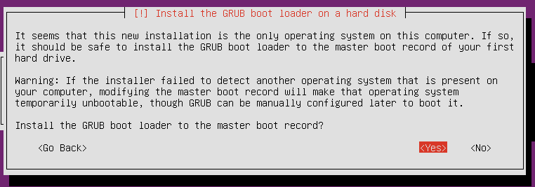 마스터 부트 레코드에 GRUB boot loader 설치를 묻는 내용입니다. 설치하고 지나갔습니다.