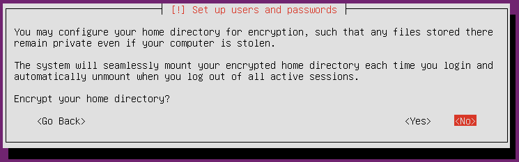 home dir을 암호화할 건지 묻는데, 저는 클러스터 테스트 용도로만 사용할 예정이기 때문에 설정하지 않았습니다.