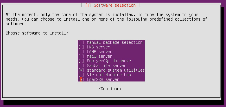 기본으로 "standard system utilites"가 선택되어 있는데, 저는 SecureCRT로 ssh 접속을 할 것이기 때문에 "OpenSSH server" 소프트웨어도 설치하였습니다.