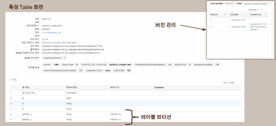 스키마가 변경되면 Crawler가 이를 수집하고 DataCatalog에서는 자동으로 버전 관리를 해줍니다.