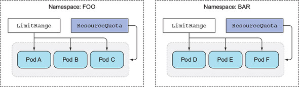 LimitRange와 같이 네임스페이스에 적용되지만, ResourceQuota는 개별 포드에 적용되지는 않는다.