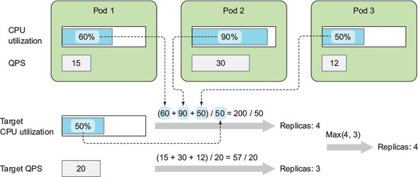 만약, 여러 메트릭을 사용하더라도 복잡해지지는 않습니다. 개별적으로 필요 Replicas를 계산한 후, Max값을 스케일링에 사용합니다.