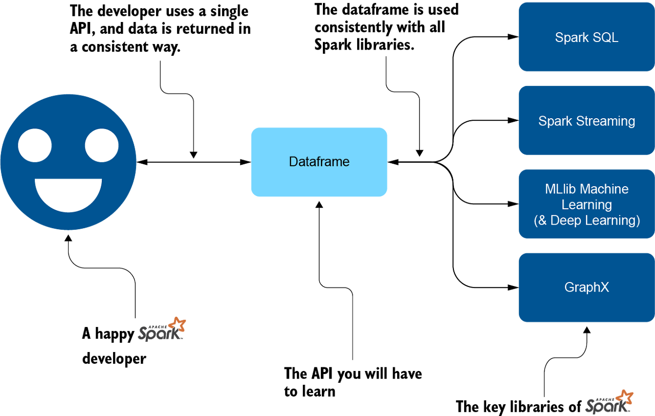 공익광고 문구 같은 내용이 책에 써져 있습니다. 근데 현업에서 사용해보니 정말 편하긴 해요. 스파크는 데이터프레임으로 Spark SQL, Spark Streaming, ML, GraphX와 같은 모든 종류의 API를 사용할 수 있습니다.
