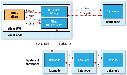 네임노드에게 파일 정보를 알려주고, 블록을 쓸 수 있는 노드 목록을 요청합니다. 이후, 반환받은 노드 목록에 파일을 저장하게 됩니다. 그리고 이때 데이터 노드 간의 블록 복제가 동시에 진행됩니다.