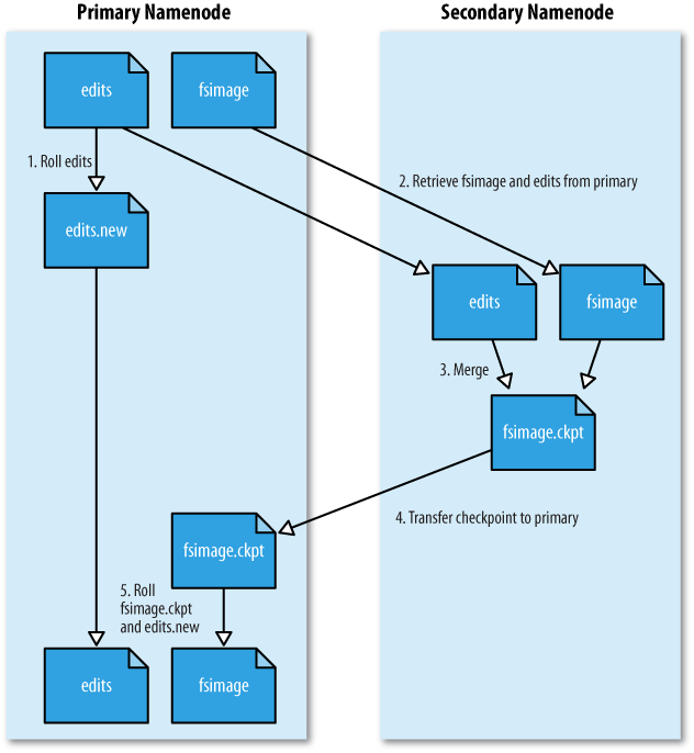 네임 노드가 구동되면, 파일의 생성/삭제 정보를 메모리에 담고 있다가 주기적으로 Edits 파일을 생성하게 됩니다. 세컨더리 네임 노드는 Edits, Fsimage의 파일이 너무 커지지 않도록 주기적으로 병합해주는 작업을 해줍니다.