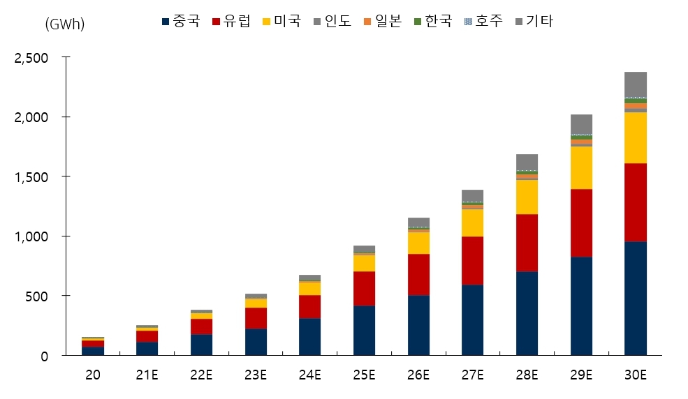 다음은 지역별 EV용 전지 수요 전망 그래프입니다.