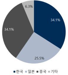 한중일 동아시아 3국이 가장 큰 파이를 차지하고 있습니다.