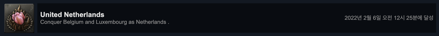 네덜란드로 플레이하여 벨기에와 룩셈부르크의 영토를 소유하면 됩니다. (평화협정이 종료된 시점에서 영토를 소유해야 클리어 된다고 합니다.) 이 도전과제는 민주주의 루트로 벨기에, 룩셈부르크와 세력 형성하고 결정 탭을 통하여 합병 또는 공산/파시즘으로 이념을 변경하여 전쟁을 통한 합병, 크게 두 가지 방법으로 클리어할 수 있을 것 같습니다.