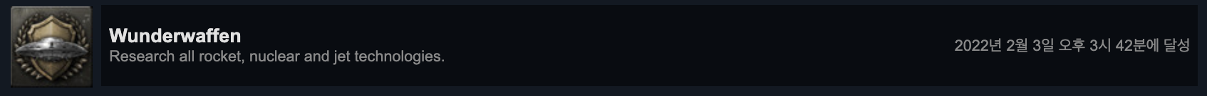 모든 로켓, 핵, 제트 기술 연구를 진행하면 클리어됩니다. 이것 또한 장기전용 도전 과제입니다.